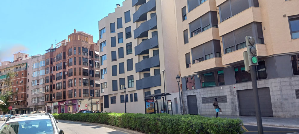 En la instantánea tomada el 1 de agosto del 2023 los pequeños inmuebles han sido sustituidos por altas construcciones, entre ellos la levantada en 1993 con ladrillo rojo cara vista en sustitución del palacete esquina a la calle Misser Rebassa.