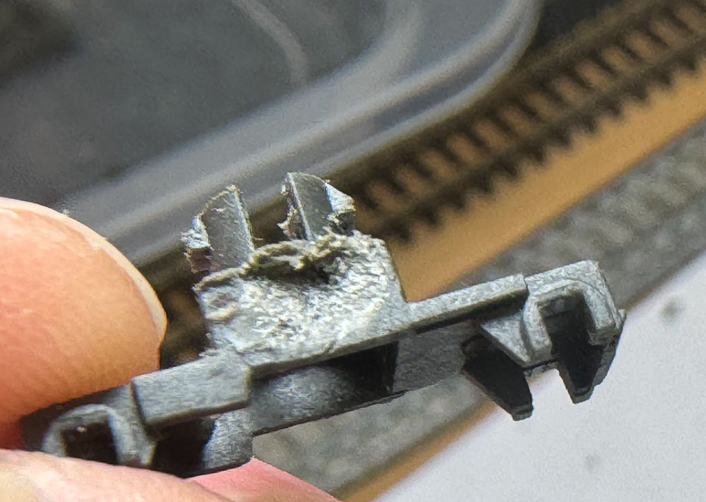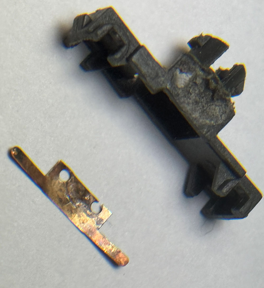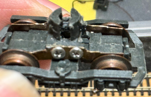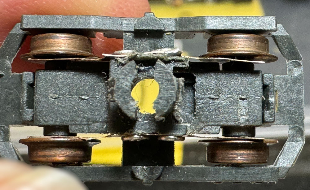 Las tomas de corriente tienen dos agujeros que se colocan en sendos tetones del bogie que se remachan con calor, pero los tetones estaban rotos y las tomas de corriente había sido pegadas en un intento de dejarlas sujetas. Además, uno de los cables también estaba desoldado y las tomas de corriente estaban sueltas al haberse despegados, quedando en el bogie sólo restos de pegamento.
