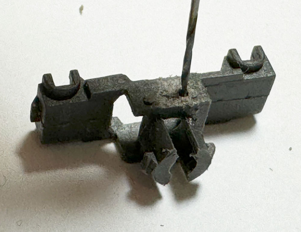 Con una broca de 1 milímetro hice un agujero en el lugar donde estaban los tetones (lo que quedaba de ellos). En la foto se puede apreciar donde estaba uno de los tetones.