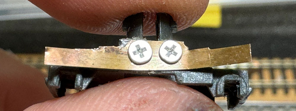 Con unas tomas de corriente para coches de viajeros de la marca Roco, procedía a hacer unas nuevas tomas para el automotor y las sujeté con dos tornillos en bogie. Son un poco grandes en comparación con las originales, pero creo que así durarán más tiempo.