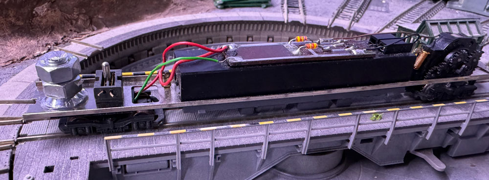 Ya solo faltaba soldar lo cables para llegar la corriente al motor y hacer las pruebas de rodadura, que no fueron todo lo satisfactorias que yo quería. Mirando que le pasaba con detenimiento, comprobé que la faltaba algo de peso a ese bogie, así que le hice uno con un tornillo y dos tuercas que le dieron el suficiente peso para que la rodadura fuera suave y la captación de corriente uniforme.