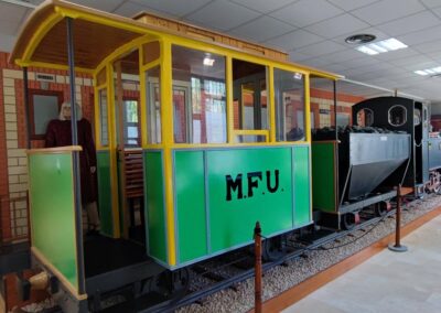 El tren, que se circula sobre vías de 60 centímetros de ancho, está compuesto por tres pequeños coches de pasajeros, de seis plazas cada uno, y una locomotora de vapor, la número 1, Hulla, de 1903, que el día de nuestra visita, lamentablemente, se hallaba fuera de servicio. Su lugar lo ocupaba una pequeña locomotora diesel Deutz, de 1958, originalmente destinada al arrastre de vagonetas en las galerías interiores de la mina.